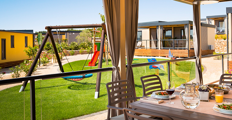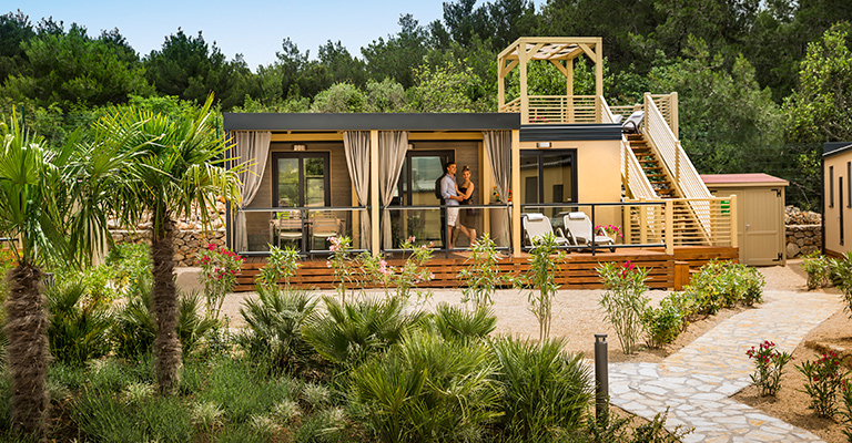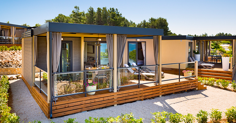 Campt luxuriös in den neuen Mobilheimen mit überdachten Terrassen, nur einen Steinwurf vom Strand entfernt und von mediterraner Natur umgeben. Ganz in der Nähe und bequem erreichbar findet ihr die anderen Campingplatzeinrichtungen, etwa die Piazza, den Kinderspielplatz, ein Restaurant und die Outdoorpools.